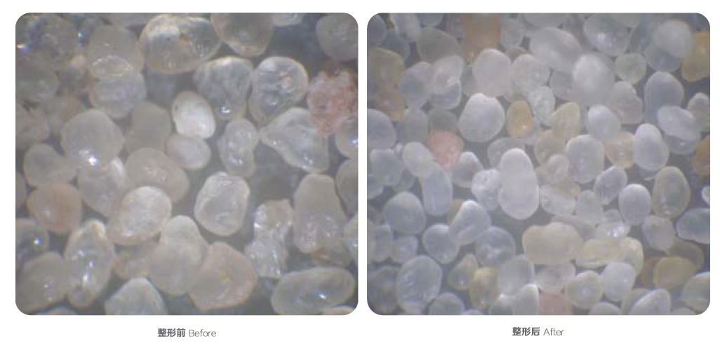 精制过程:通过对原砂的整形处理提高圆球度(整形效果对比图如下)